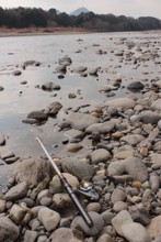 / 川,山,岩石,釣り竿,河畔植生,植物,木