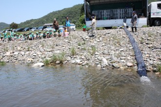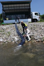 / 人,魚,バケツ,岩石,帽子,子供,川,しぶき,植物,河畔植生