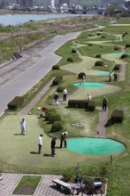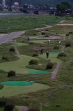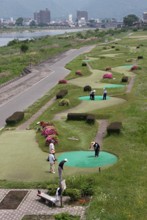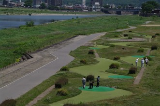 / 人,川,河畔植生,花,帽子,建物,橋,ゴルフ,自転車,車,植物,木,旗,ベンチ