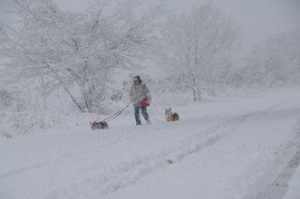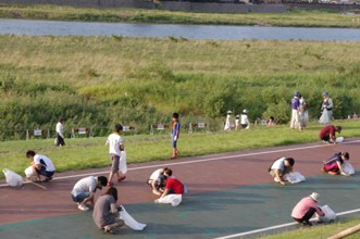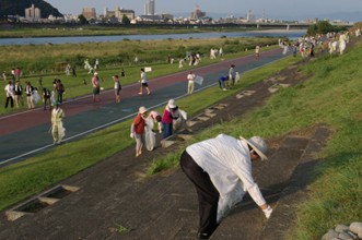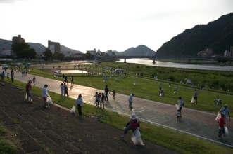 / 人,堤防,川,河畔植生,植物,木,袋,建物,手袋,空,山,車,橋,子供,帽子