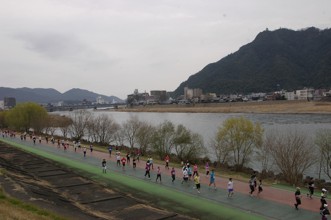 / 川,人,山,金華山,城,岐阜城,木,植物,河畔植生,建物,橋,消波ブロック,子供,帽子
