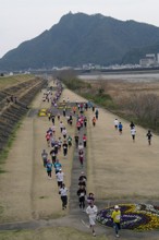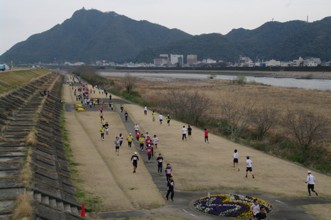 / 人,堤防,川,河畔植生,植物,木,袋,建物,手袋,空,山,金華山,城,岐阜城,帽子