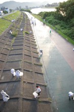 / 人,堤防,川,河畔植生,植物,木,袋,建物,傘,手袋,帽子