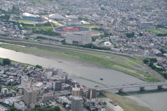 / 橋,車,川,建物,球状,競技場,鳥,植物,木,河畔植生