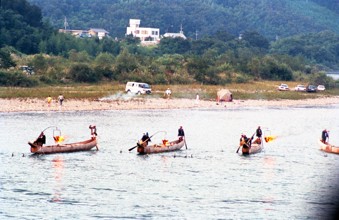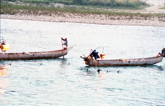 / 鵜飼い漁,人,鵜,植物,船,川,河畔植生,岩石
