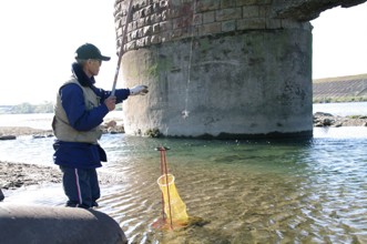/ 人,帽子,川,バケツ,消波ブロック,長靴,魚,釣り竿,植物,木,河畔植生,山,空,橋,網,鉄塔,手袋