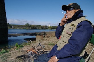 / 人,川,眼鏡,サングラス,煙草,腕時計,椅子,山,空,建物,植物,河畔植生,木,堤防