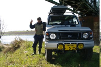 / 車,人,眼鏡,サングラス,ピ-スサイン,川,堤防,長靴,植物,木,河畔植生,橋,建物,空