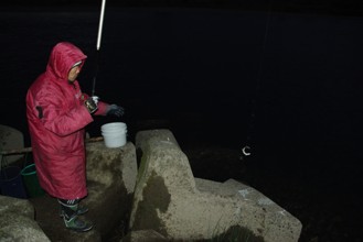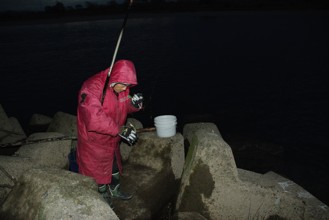 / 人,長靴,バケツ,手袋,消波ブロック,釣り竿,魚,夜