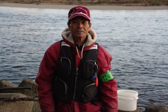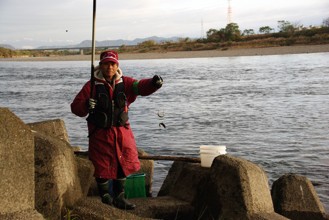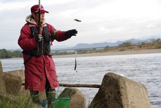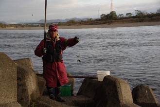 / 人,帽子,川,手袋,眼鏡,サングラス,網,釣り竿,魚,岩石,植物,河畔植生,堤防