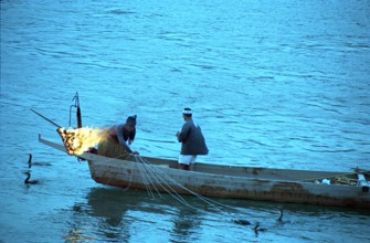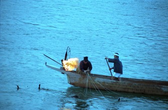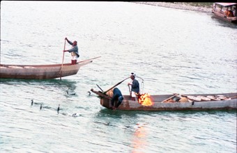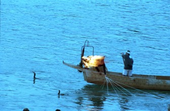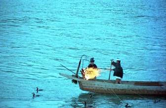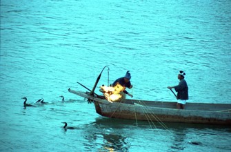 薄暮鵜飼い / 鵜飼い漁,船,人,鵜,服,かがり火,川