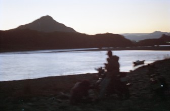 / 山,人,船,夕焼け,川,帽子,バイク