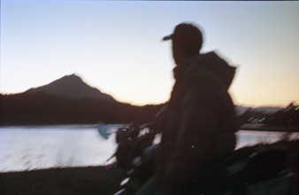 / 山,人,夕焼け,川,帽子,バイク