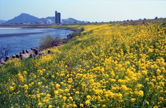 金華山遠景 / 植物,花,建物,消波ブロック,山,車,堤防,木,河畔植生