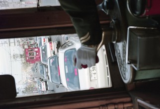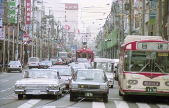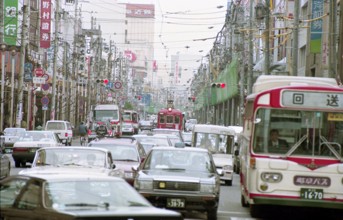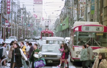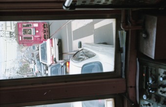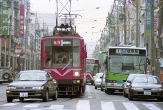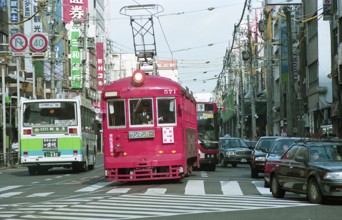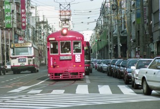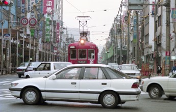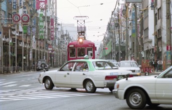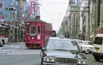 / 看板,商店,路面電車,鉄道,電線,車,電柱,工事,横断歩道,道路,信号,建物,標識,タクシー,自転車,人,カラーコーン,バス停,空
