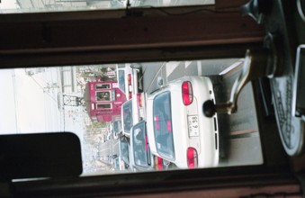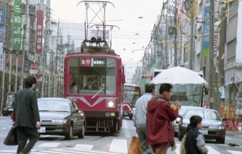 / 傘,眼鏡,鞄,袋,看板,商店,路面電車,鉄道,バス,電線,車,電柱,工事,横断歩道,道路,信号,建物,標識,人,カラーコーン,空