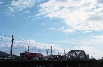 名鉄市内電車 / 人,橋,車,路面電車,建物,制服,服,電柱,街灯
