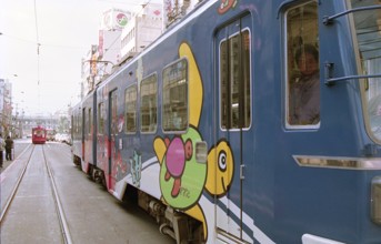 / 看板,商店,路面電車,鉄道,電線,車,電柱,工事,横断歩道,道路,信号,建物,標識,タクシー,自転車,人,カラーコーン,袋,バス停,空