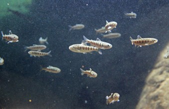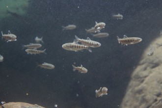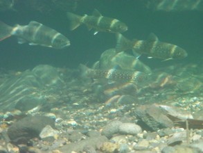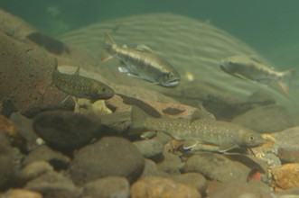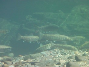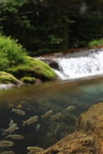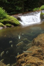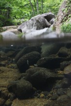 / 川,岩石,水中,魚,河畔植生,植物,木,森林
