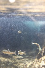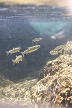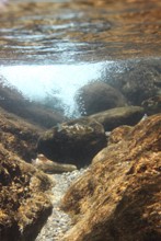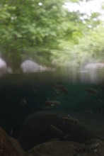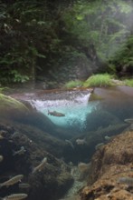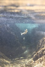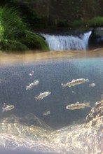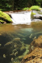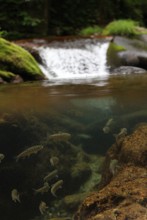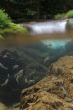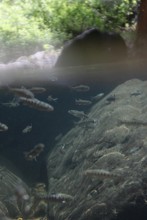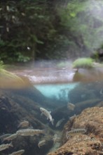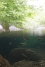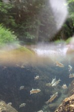 / 川,岩石,水中,魚,河畔植生,植物,木,森林