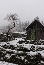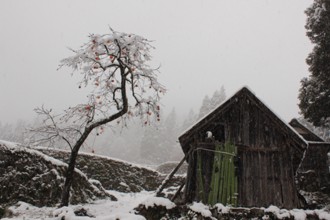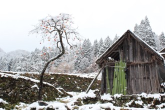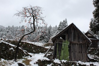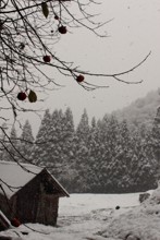 / 雪,建物,植物,木,実,柿,空,支柱