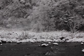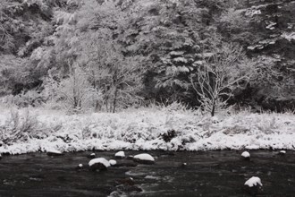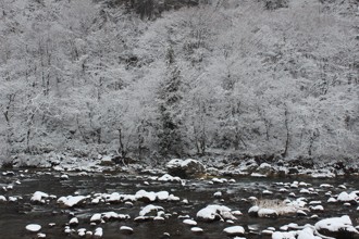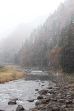 / 川,岩石,植物,河畔植生,木,紅葉,雪