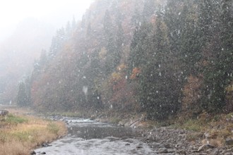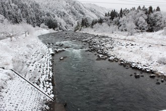 / 川,岩石,植物,河畔植生,木,紅葉,雪,建物,車,ガードレール