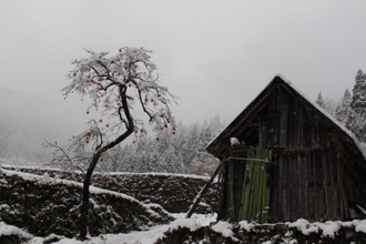 / 雪,建物,植物,木,実,柿,空