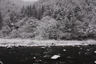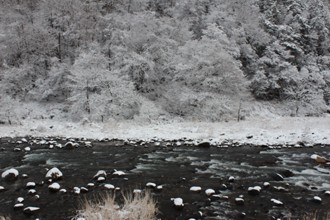 / 川,岩石,雪,植物,河畔植生,木,山,空