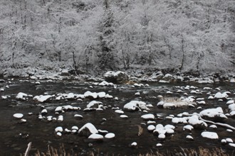 / 川,岩石,雪,電線,植物,河畔植生,木,空