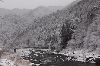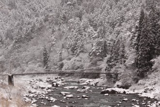 / 川,岩石,雪,植物,河畔植生,木,橋,山