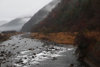 / 川,岩石,植物,河畔植生,木,紅葉,霧,山,空,石垣