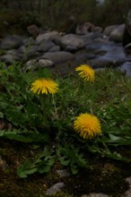 / 川,岩石,植物,河畔植生,花,タンポポ,たんぽぽ
