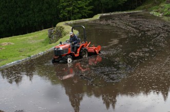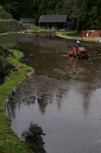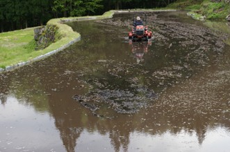 / 水田,作業車,人,帽子,代掻き,植物,木,石垣,手袋,長靴,空
