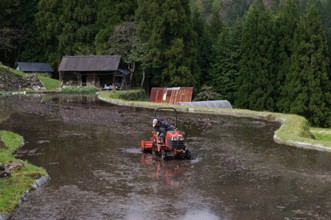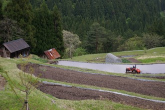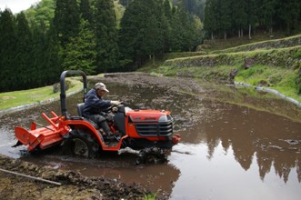 / 水田,作業車,人,帽子,代掻き,植物,木,石垣,手袋,建物,畑,柵