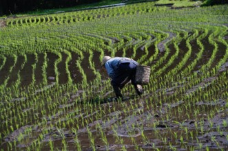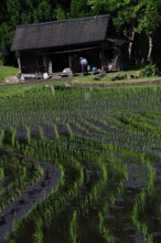 / 水田,人,カゴ,帽子,長靴,植物,建物,バケツ,木