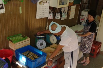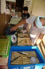 / 人,バケツ,魚,はかり,発泡スチロール,タオル,カレンダー,氷