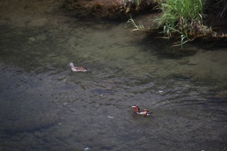 / 川,岩石,植物,河畔植生,鳥,鴨,カモ,オシドリ