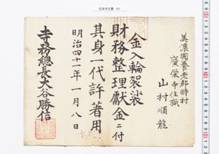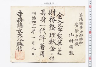 〔財務整理献金につき金入輪袈裟の一代許着用の書付〕