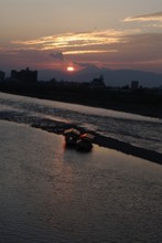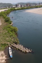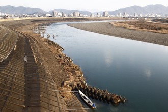 / 川,船,消波ブロック,空,山,建物,堤防,河原
