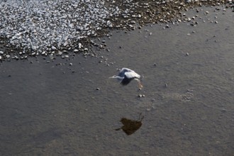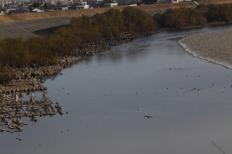 / 川,植物,河原,鳥,水鳥,建物,堤防,電柱,電線
