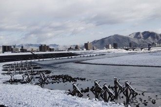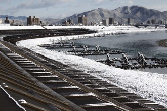 / 堤防,河原,川,山,空,雲,雪,建物
