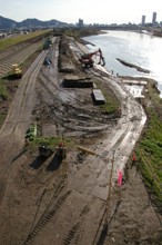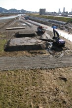 / 川,植物,河畔植生,重機,カラーコーン,堤防,山,空,建物,車,鉄塔