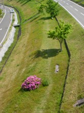 / 堤防,カーブミラー,植物,木,花,ツツジ,車,電柱,階段,道路