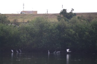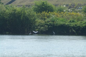 / 川,河原,植物,河畔植生,車,鳥,鷺,サギ,堤防