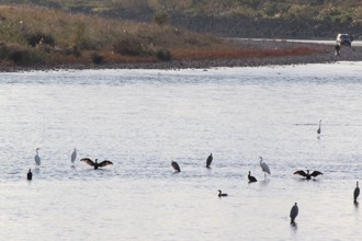 / 川,河原,植物,河畔植生,車,鳥,鷺,サギ,堤防,人