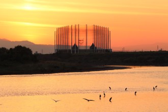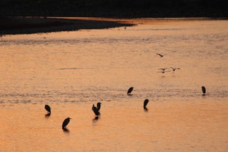 / 川,河原,鳥,サギ,鷺,植物,山,鉄塔,電線,建物,空,夕焼け