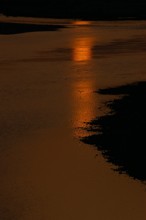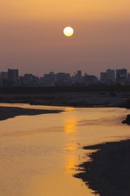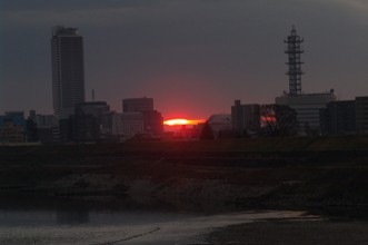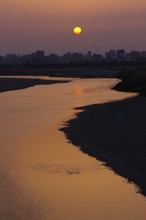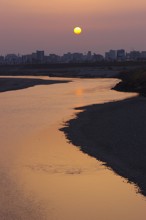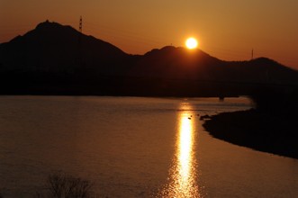 / 川,太陽,夕焼け,水面,山,鉄塔,電線,河原,植物,木