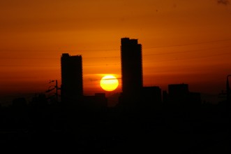 / 電線,電柱,建物,夕日,太陽,夕焼け,空
