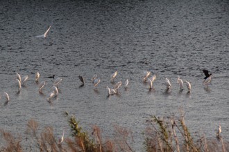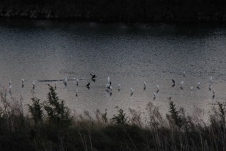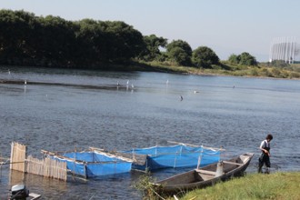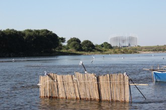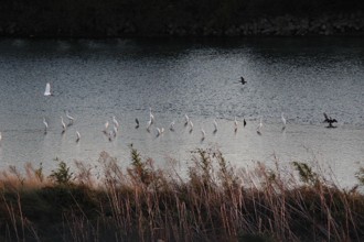 / 川,鳥,サギ,鷺,植物,木,河畔植生,建物,空,船,人,胴長,網,エンジン